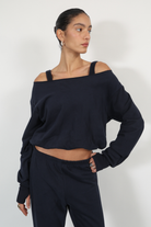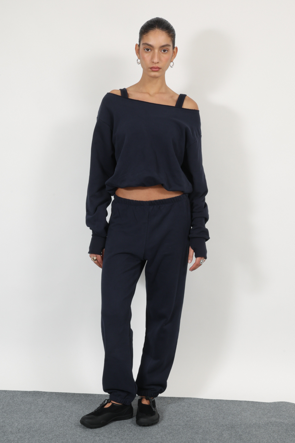 relaxed two-piece set featuring an off-the-shoulder top with strap detail and matching jogger pants with an elasticated waist and hem nevy blue color