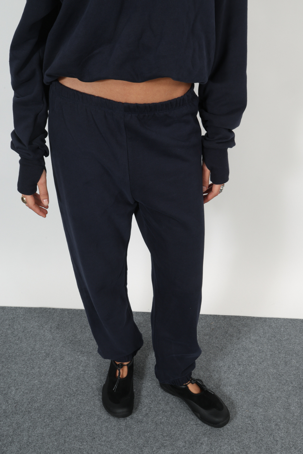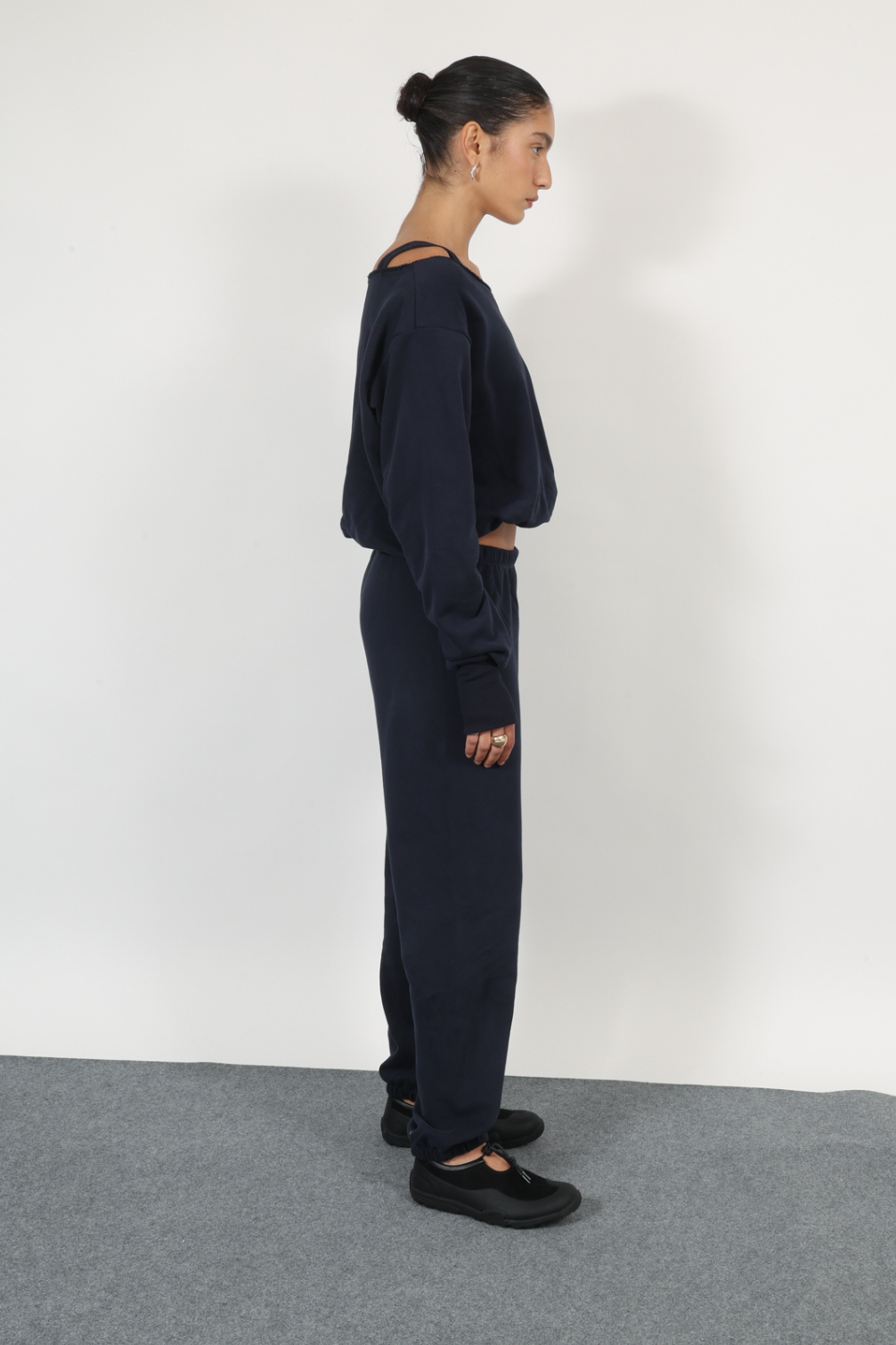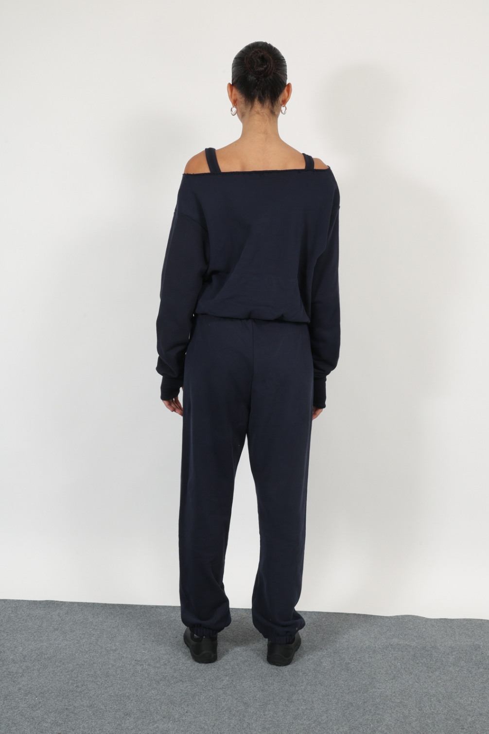 relaxed two-piece set featuring an off-the-shoulder top with strap detail and matching jogger pants with an elasticated waist and hem nevy blue color